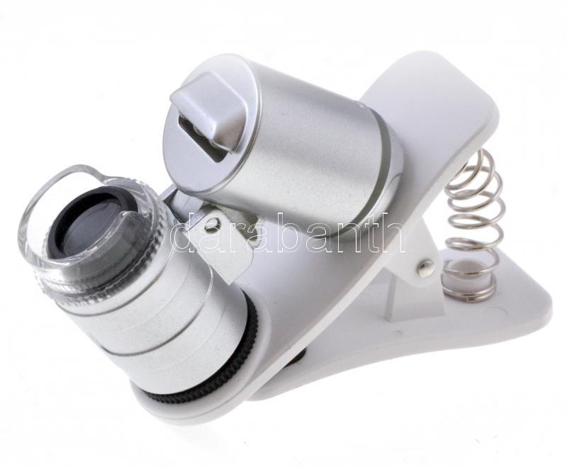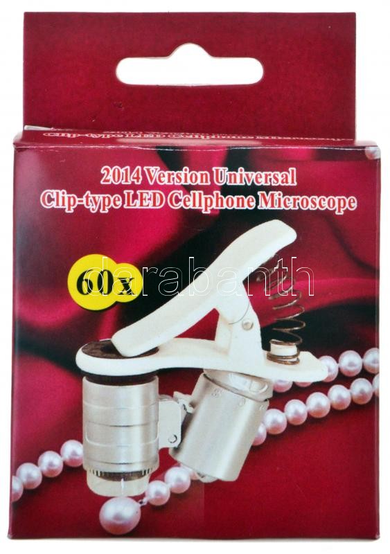 Új, mobiltelefon kamerájára szerelhető 60x-os LED-es nagyító hozzá rögzített lámpával, eredeti dobozában, leírással New 2014 Version Universal Clip-type LED Cellphone Microscope, 60x, in its case, with information