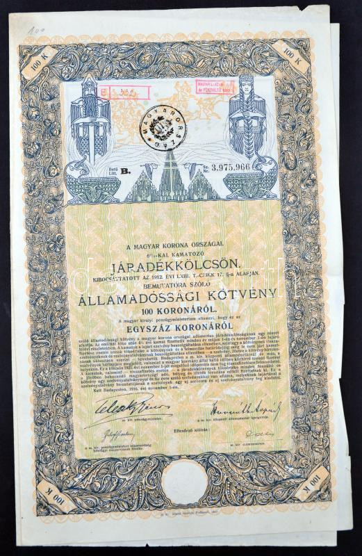 Budapest 1916. "A Magyar Korona Országai 6%-kal kamatozó járadékkölcsön" államadóssági kötvény 100K-ról, szelvényekkel, szárazpecséttel és bélyegzéssel T:III