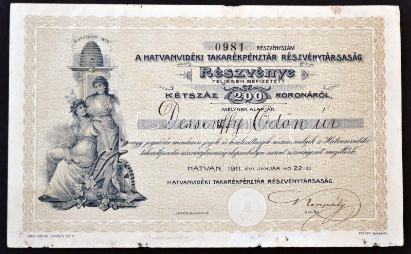 Leírás: Hatvan 1911. "A Hatvanvidéki Takarékpénztár Részvénytársaság" részvénye 200K-ról szelvényekkel T:II-
