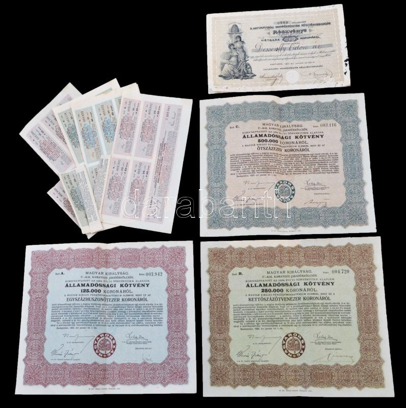 Leírás: Hatvan 1911. "A Hatvanvidéki Takarékpénztár Részvénytársaság" részvénye 200K-ról szelvényekkel + Budapest 1925. "Magyar Királyság 5%-kal kamatozó járadékkölcsön" államadóssági kötvény 125.000, 250.000, 500.000K-ról szelvényekkel T:II,II-,III