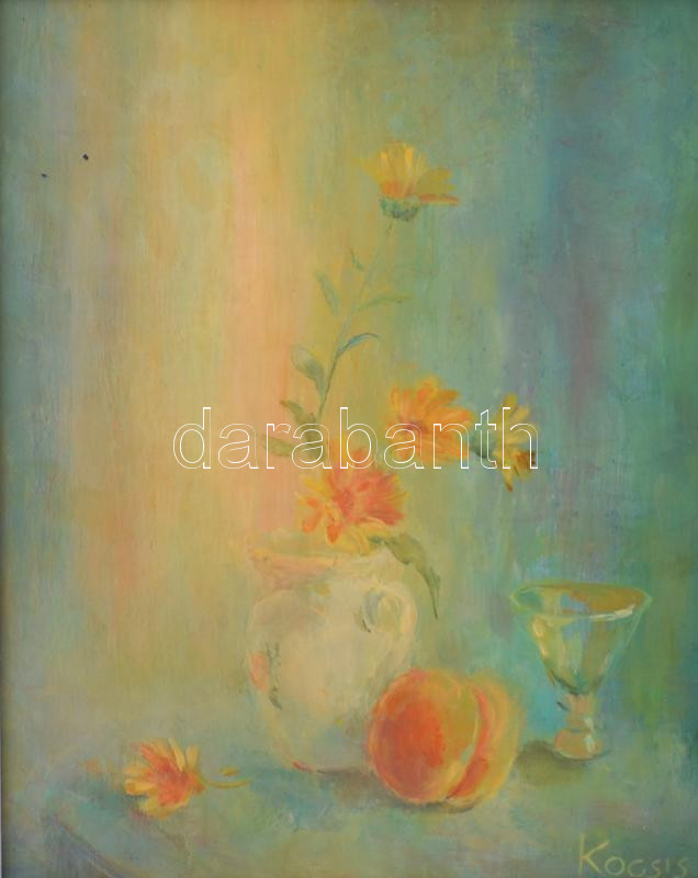 Leírás: Kocsis Valéria (?- ): Csendélet, olaj, farost, jelzett, keretben, 28,5×22,5 cm