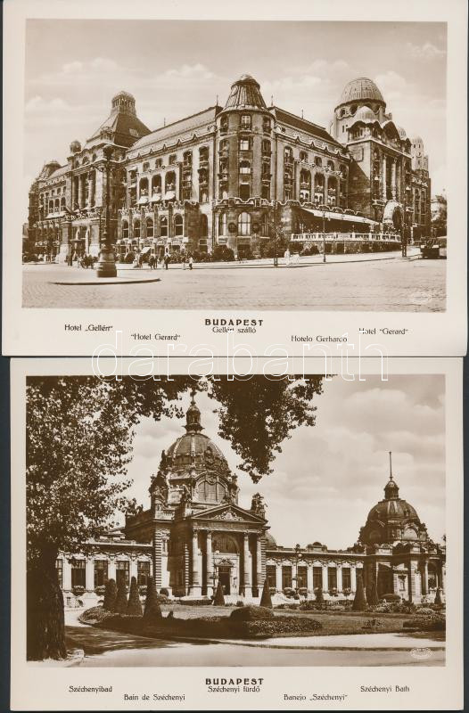 Leírás: 3 db Budapest híres épületeit ábrázoló fotó, többnyelvű képaláírással. 1930-as években készült képek modern másolatai.