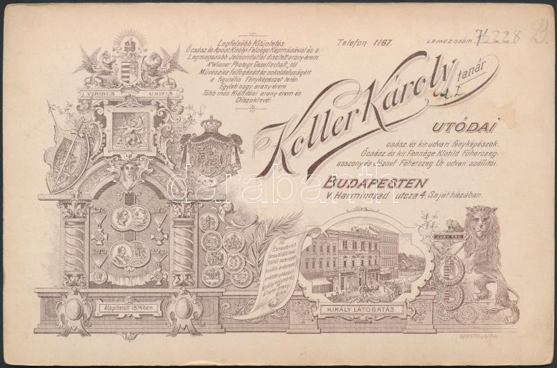 Leírás: cca 1880 Koller műterem keményhátú műtermi fotója, királyi látogatást ábrázoló rajzos verzóval, 17x11 cm