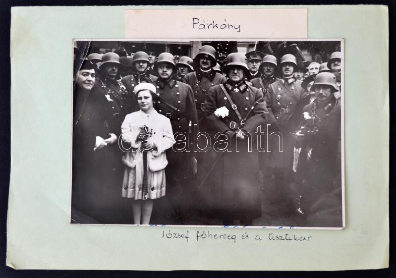 1938 "József főherceg és a tisztikar" 1938. november 6-án az József Ágost királyi herceg tábornagy vezetésével az I. vegyes dandár Esztergomnál ünnepélyesen átvonul a Mária Valéria hídon - az I. bécsi döntés értelmében újra Magyarországhoz tartozó - Párkányba. Középen, fehér virággal József Ágost, jobbján vitéz nagybaconi Nagy Vilmos vezérkari főnök. Papírra ragasztott fotó, feliratozva. 18x12 cm.