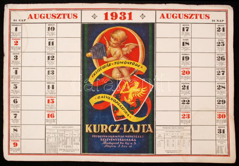 Leírás: 1931 Kurcz és Lajta Fotocinkográfiai Műintézetének Részvénytársasága által kiadott augusztus havi naptár, kis szakadásokkal, 33x48 cm