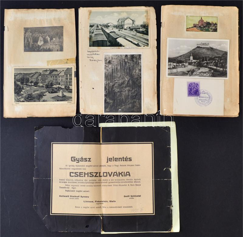 Leírás: cca 1938 -40 Gyűjtemény a "magyar történelem fenséges pillanatairól", benne újságkivágások, képeslapok, bélyegek visszatért bélyegzéssel, 25x17cm