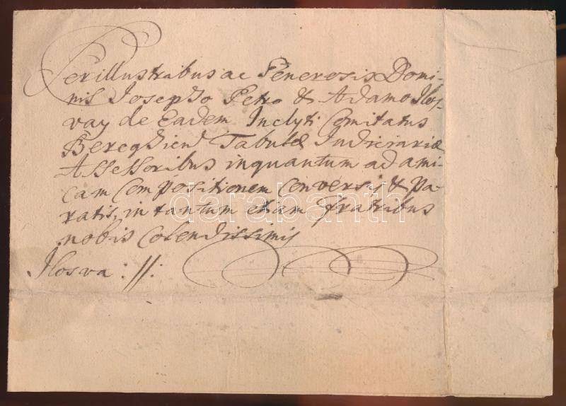 1772 Tiszabercel, Bessenyei György és Lővey Ádám, illetve feleségeik kézzel írott, magyar nyelvű levele az Ilosvay-család tagjainak (Józsefnek, Péternek és Ádámnak) a közöttük levő pereskedés békés rendezése tárgyában