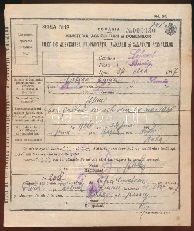 1937 Román marhalevél különféle okmánybélyegekkel https://www.darabanth.com/hu/263-Gyorsarveres/263.0/Festmeny-mutargy-papirregiseg-egyeb/Okmanyok~27/1937-Roman-marhalevel-kulonfele-okmanybelyegekkel~II1313036