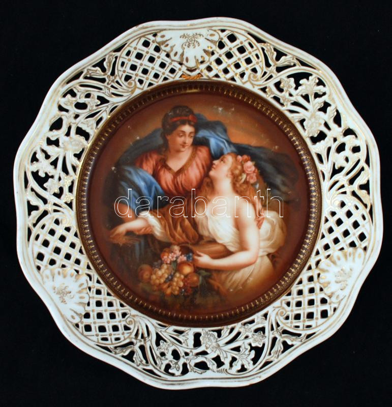 Leírás: Schumann Dresden áttört falitányér allegorikus jelenttel, matricás, jelzett, kopás nyomokkal, d:22,5 cm