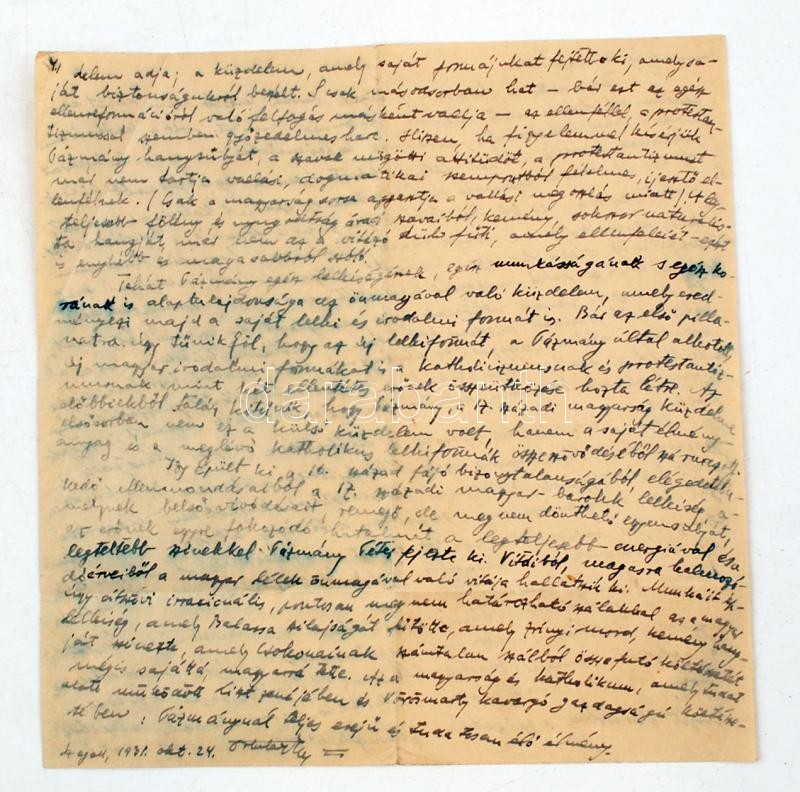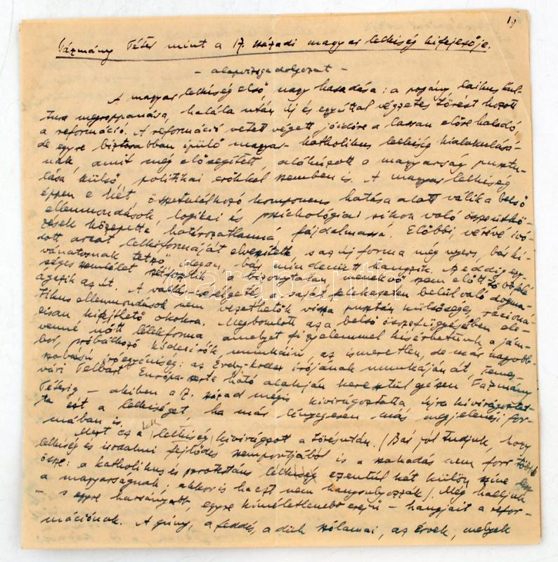 Ortutay Gyula (1910-1978) néprajzkutató, művelődési miniszter "Pázmány Péter mint a 17. századi magyar lelkiség kifejezője" című autográf alapvizsga dolgozata. Aláírt, datált. Szeged, 1931. okt. 24. 2 lev. 4 beírt oldal.