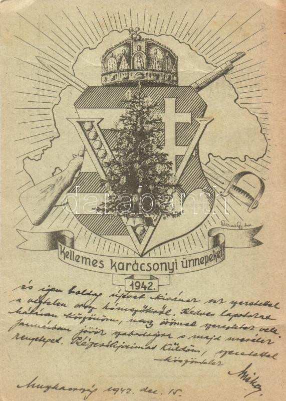 Leírás: 1942 WWII Hunagrian military Christmas, coat of arms, guns s: Cserna Gy. őrnagy (fa)