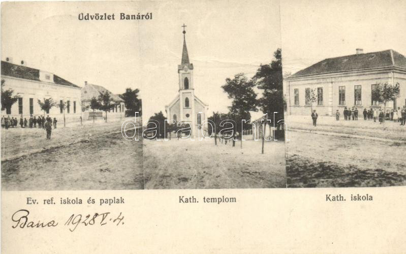Leírás: Bana, Evangélikus Református iskola és paplak, Katolikus templom és iskola