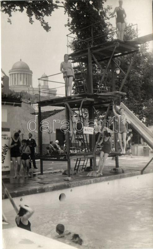Leírás: Esztergom, Strand, háttérben a Bazilika, mélyvíz medence, Róna foto, photo