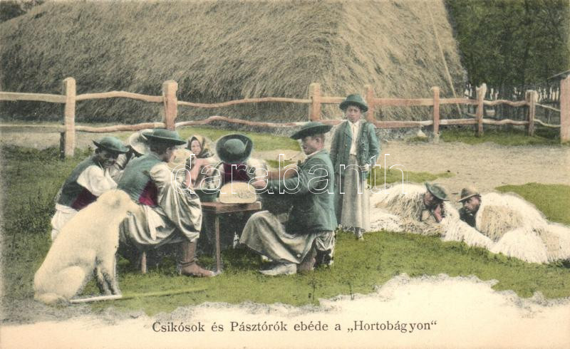 Leírás: Hortobágy, ebédelő csikósok és pásztorok
