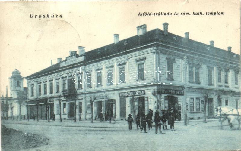 Leírás: Orosháza, Alföld-szálloda és Római Katolikus templom, Wigner Géza üzlete (EK)
