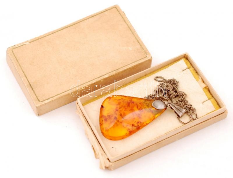 Borostyán medál ezüst lánccal / Amber broche, with silver chain 12,6 g https://www.darabanth.com/hu/263-Gyorsarveres/263.0/Nemesfem-Disztargyak-Orak-es-Ekszerek/Nemesfem-Disztargyak-Orak-es-Ekszerek~44/Borostyan-medal-ezust-lanccal-Amber-broche-with-silver-chain-12-6-g~II1311148