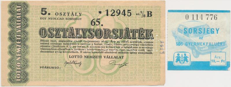 Leírás: 1950. "65. Osztálysorsjáték - 5. osztály egy nyolcad sorsjegy" + DN "Sorsjegy az SOS Gyermekfaluért" 10Ft értékben T:II-