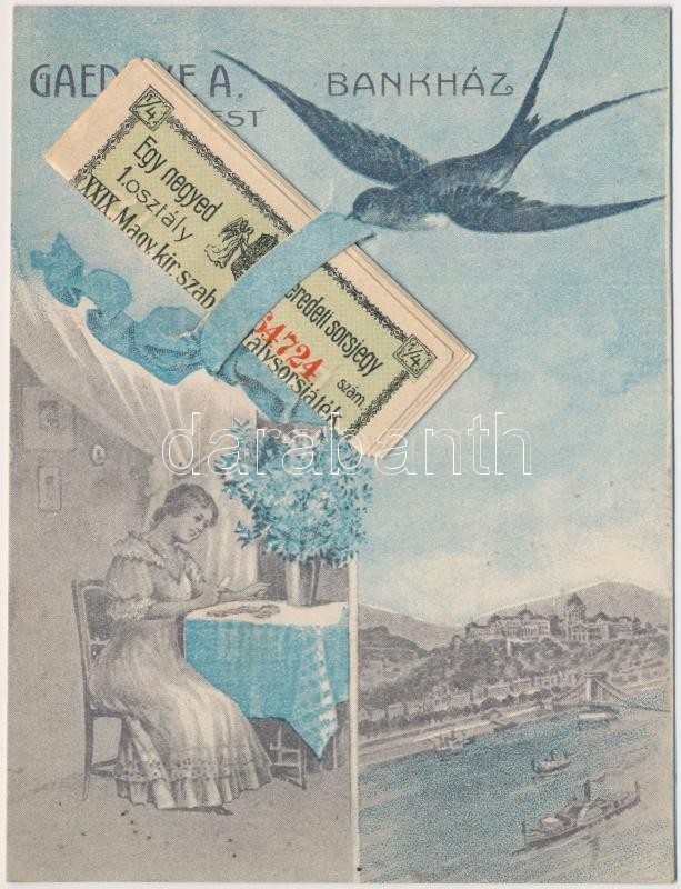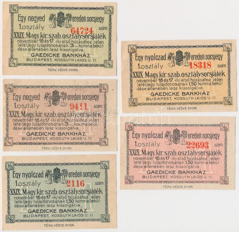 Budapest ~1910. "XXIX. Magyar királyi szabadalmazott osztálysorsjáték - Gaedicke Bankház" 1/4 sorsjegy, első osztály (2xklf) + 1/8 sorsjegy, első osztály (3xklf), Gaedicke Bankház gyűjtőlappal (rajta kis szakadás) T:II