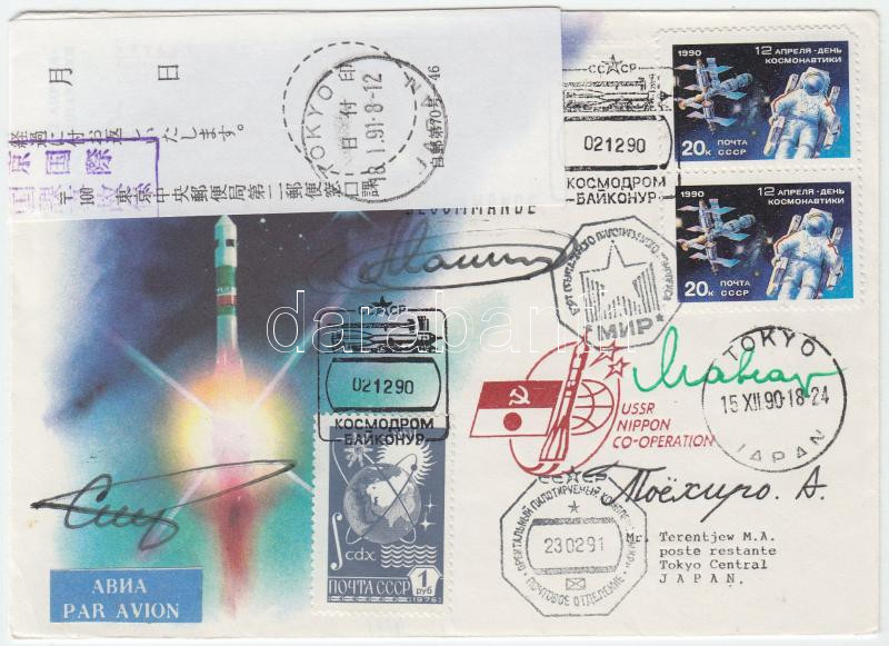 Leírás: Toyohiro Akiyama (1942- ) japán, Gennagyij Sztrekalov (1940-2004), Musza Manarov (1951- ) és Gennagyij Manakov (1950- ) orosz űrhajósok aláírásai emlékborítékon /