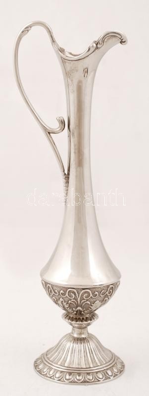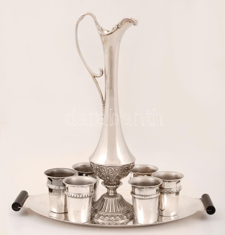 Leírás: Ezüstözött alpakka kupicás készlet füles tálcával + dísz kiöntő, jelzett, jó állapotban, 26×12 cm, m:5 cm (6×), m:24 cm