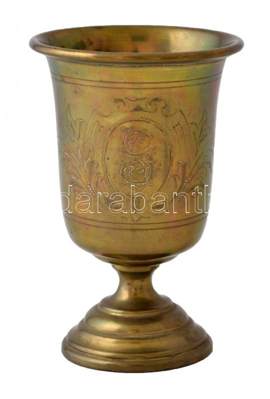 Leírás: Réz talpas pohár, gravírozott címerrel, m:11 cm