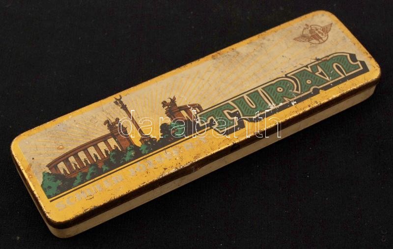 Leírás: Schuler József R.T. feliratú fém ceruzatartó, benne számos Turán ceruza, rajzoló-, ill. másoló-irón.