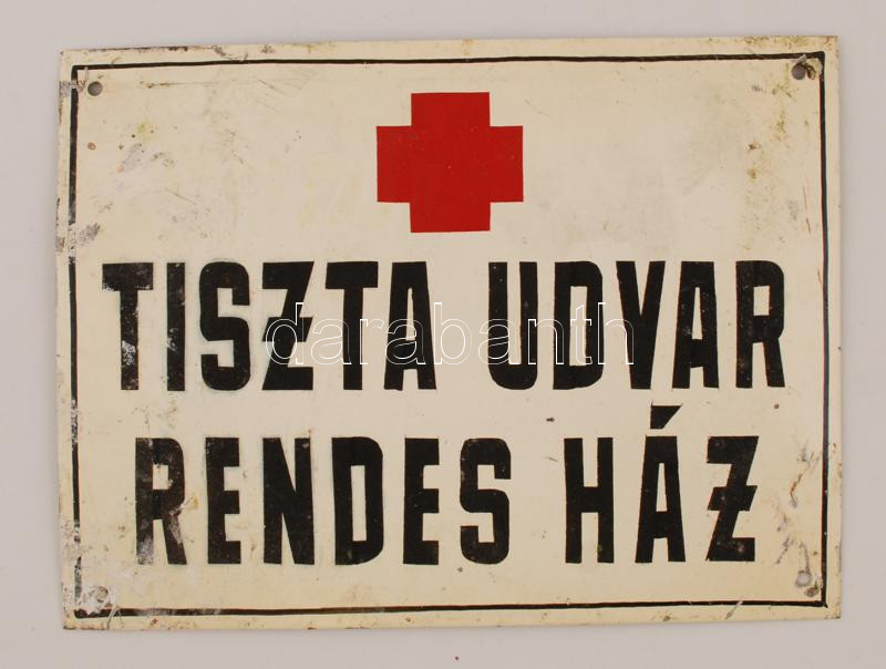 "Tiszta udvar, rendes ház" zománcozott fém tábla, kopásnyomokkal, 15x2... https://www.darabanth.com/hu/264-Gyorsarveres/264.0/Festmeny-mutargy-papirregiseg-egyeb/Bolhapiac~10/Tiszta-udvar-rendes-haz-zomancozott-fem-tabla-kopasnyomokkal-15x20-cm~II1318801