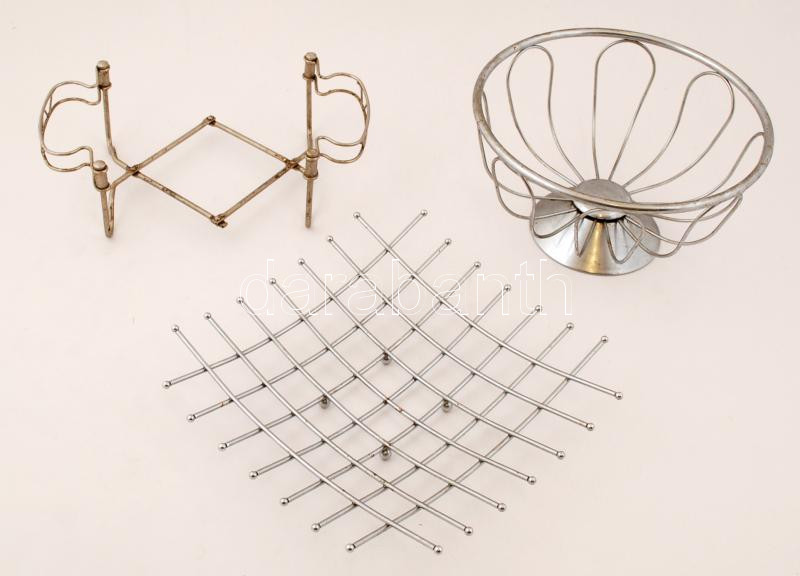 Leírás: Vegyes fém tétel, lábosalátét, kenyértartó, gyümölcskosár, 3db