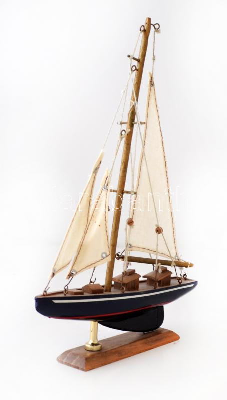 Leírás: Vitorlás makett, festett fa-textil, h:19 cm, m:29 cm