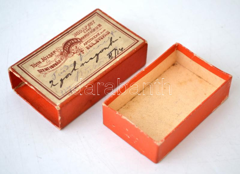 Leírás: cca 1900 Tóth József "Szent István" gyógyszertár papír doboza, 3,5x6x2,5cm