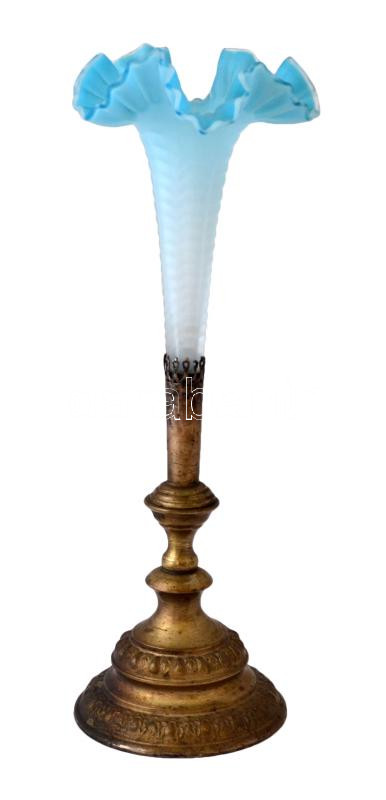 Leírás: cca 1930 Optikailag díszített, fúvott üvegváza fém talppal, két részes, javított, 35cm