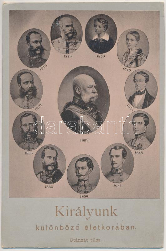 cca 1900 I. Ferenc József "Királyunk különböző életkorában", fénynyom... https://www.darabanth.com/hu/264-Gyorsarveres/264.0/Festmeny-mutargy-papirregiseg-egyeb/Foto~18/cca-1900-I-Ferenc-Jozsef-Kiralyunk-kulonbozo-eletkoraban-fenynyomat-kartonra-kasirozv~II1319944