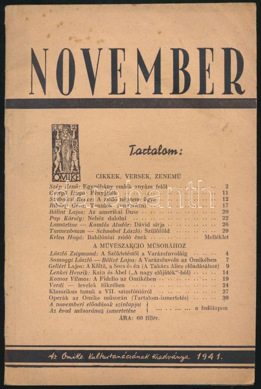 1941 Az OMIKE Kulturtanácsának Kiadványa. Novemberi szám. https://www.darabanth.com/hu/264-Gyorsarveres/264.0/Festmeny-mutargy-papirregiseg-egyeb/Judaika~22/1941-Az-OMIKE-Kulturtanacsanak-Kiadvanya-Novemberi-szam~II1320681