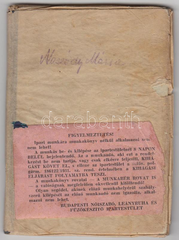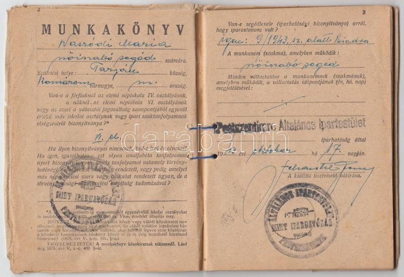 1943 Munkakönyv, pp.:63, 14x10cm https://www.darabanth.com/hu/264-Gyorsarveres/264.0/Festmeny-mutargy-papirregiseg-egyeb/Okmanyok~15/1943-Munkakonyv-pp63-14x10cm~II1320189