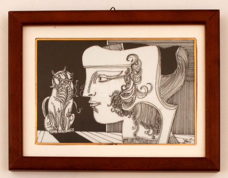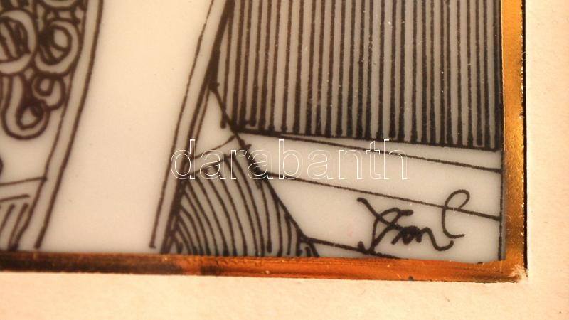 Leírás: Hollóházi Szász Endre által tervezett porcelán kép, matricás, hibátlan, jelzett, üvegezett fa keretben, 11x17 cm