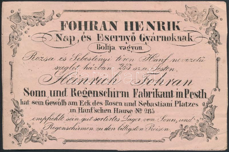cca 1840 Fohran Henrik budapesti nap- és esernyő gyáros reklámfelirato... https://www.darabanth.com/hu/264-Gyorsarveres/264.0/Festmeny-mutargy-papirregiseg-egyeb/Reklam~19/cca-1840-Fohran-Henrik-budapesti-nap-es-esernyo-gyaros-reklamfeliratos-szamlaja~II1319594