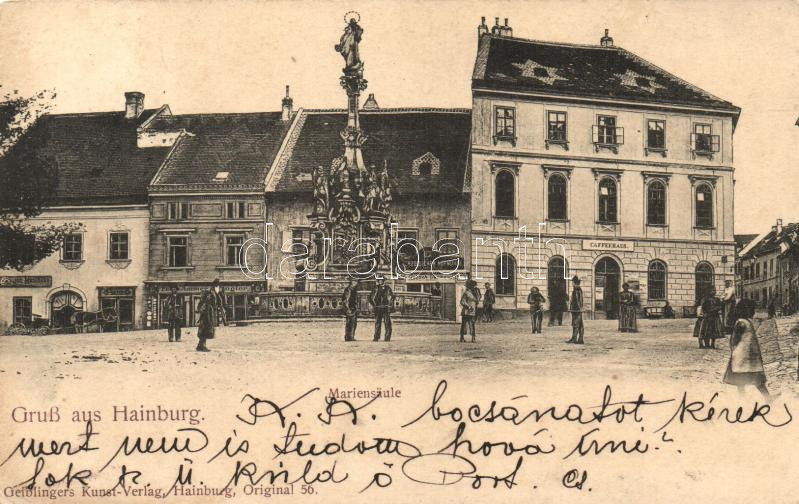 Leírás: Hainburg an der Donau; Mariensaule, Caffeehaus, Gebach verkauf / statue of Virgin Mary, coffe shop, bakery (EK)