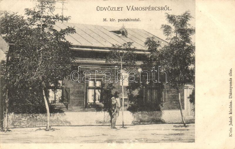 Vámospércs, M. kir. postahivatal, kiadja Klein Jakab https://www.darabanth.com/hu/264-Gyorsarveres/264.0/Kepeslapok/Magyarorszag~200025/Vamospercs-M-kir-postahivatal-kiadja-Klein-Jakab~II1318179