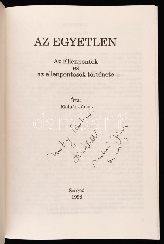 Molnár János: Az egyetlen. Szeged, 1993, magánkiadás. Dedikált példány... https://www.darabanth.com/hu/264-Gyorsarveres/264.0/Konyvek/Konyvek-Egyeb-ritkasagok~40/Molnar-Janos-Az-egyetlen-Szeged-1993-magankiadas-Dedikalt-peldany~II1313851