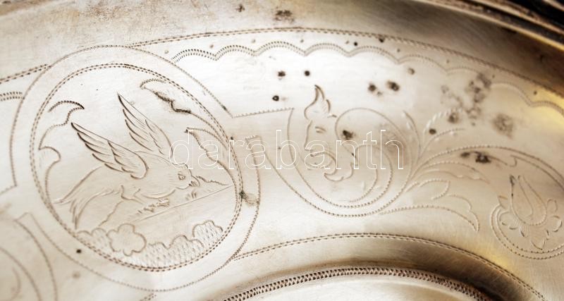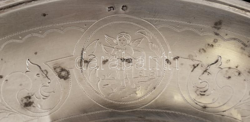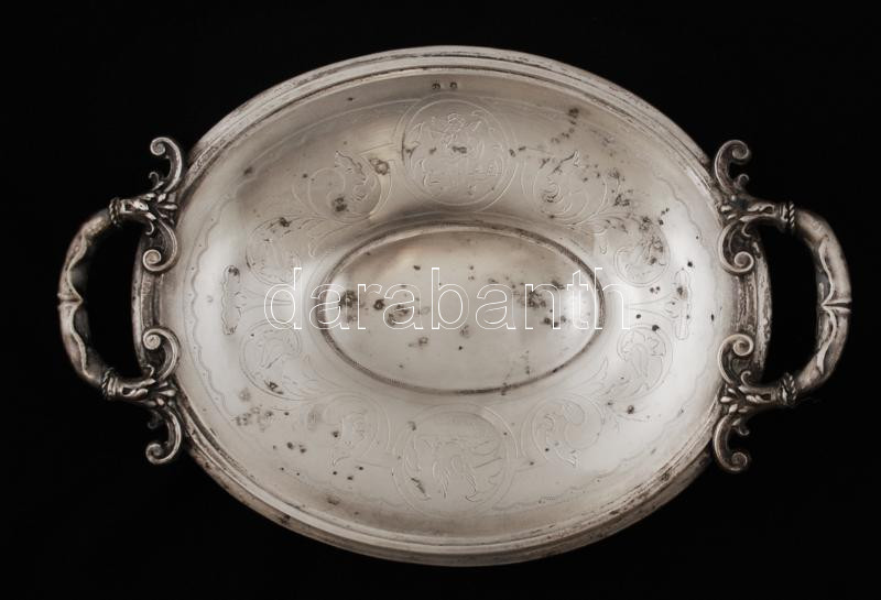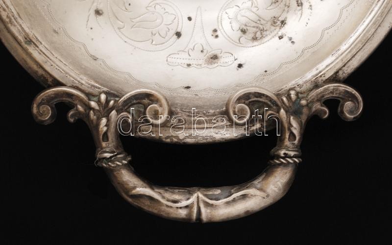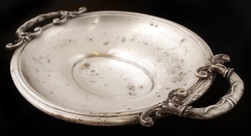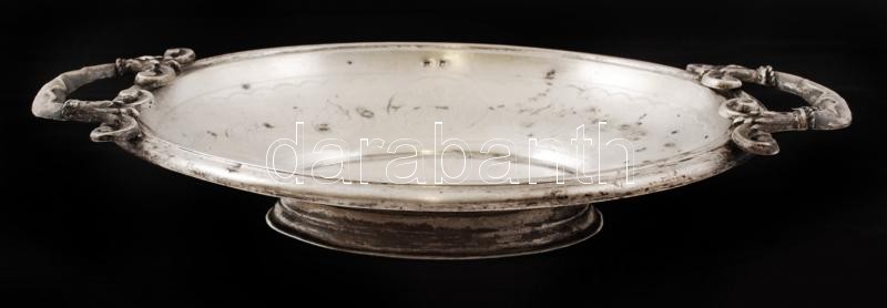 Leírás: Ezüst (Ag.) füles kínáló tál, jelzett, mesterjeggyel (SH), nettó:235 g, 30×20 cm