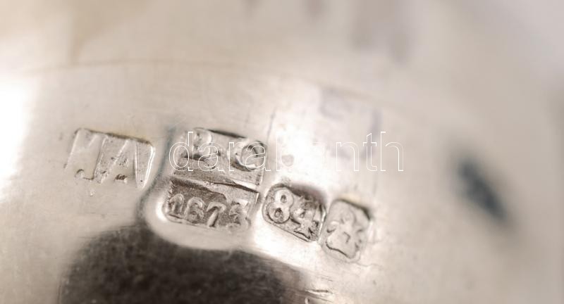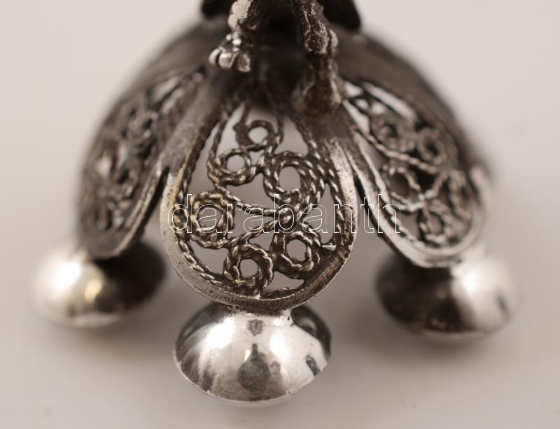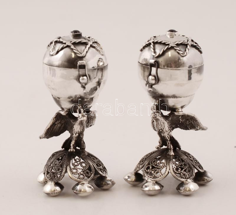 Leírás: Ezüst (Ag.) fűszertartó párban szintetikus kővel, jelzett, m:8 cm (2×) nettó:104 g (együtt a kettő)