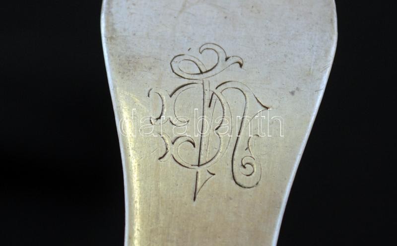 Leírás: Ezüst (Ag.) leveses kanál, monogrammal, jelzett, mesterjeggyel (KM), h:22 cm, nettó: 415 g