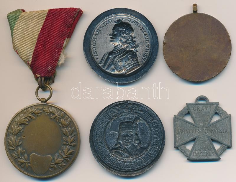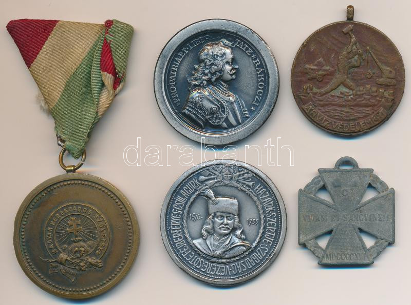 Leírás: 5db-os vegyes magyar érem és kitüntetés tétel, közte ~1930. "Magyar Kerékpáros Szövetség" Br érem mellszalagon (38mm), DN "II. Rákóczi Ferenc" fém lemezérem (38mm) T:vegyes