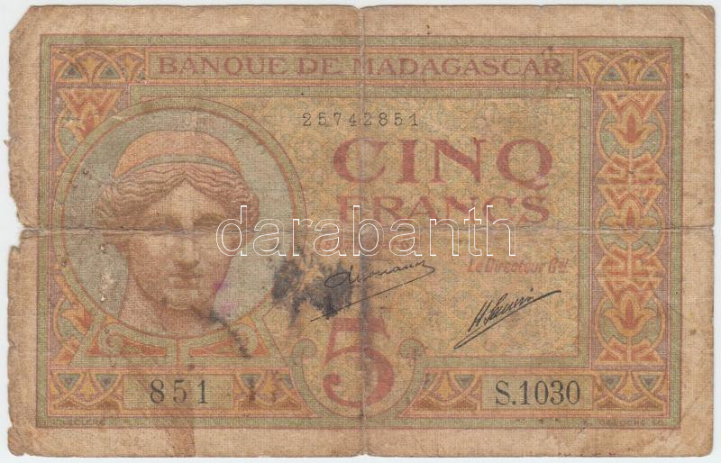 Madagascar 1937. 5 Francs C:VF https://www.darabanth.com/hu/264-Gyorsarveres/264.0/Numizmatika/Kulfoldi-bankjegyek~300010/Madagaszkar-1937-5Fr-TIII---Madagascar-1937-5-Francs-CVF~II1318438