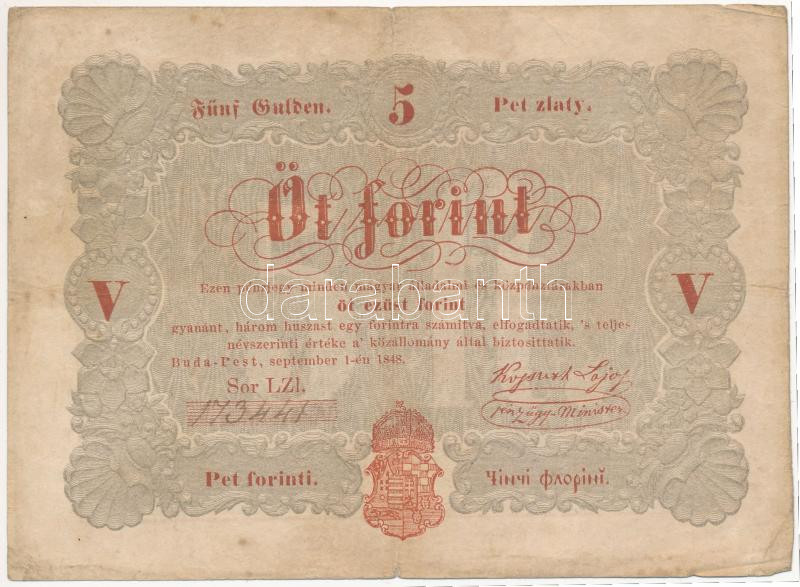 Leírás: 1848. 5Ft "Kossuth bankó" vörösesbarna T:III,III-