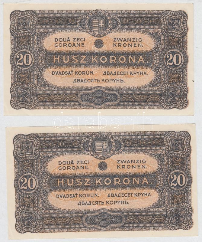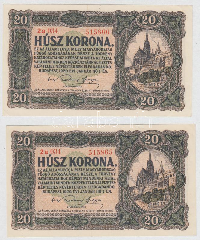 1920. 20K (2x) sorszámkövetők T:I- https://www.darabanth.com/hu/264-Gyorsarveres/264.0/Numizmatika/Magyar-bankjegyek~300006/1920-20K-2x-sorszamkovetok-TI-~II1314022