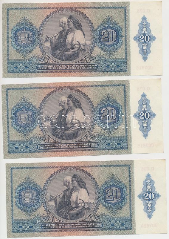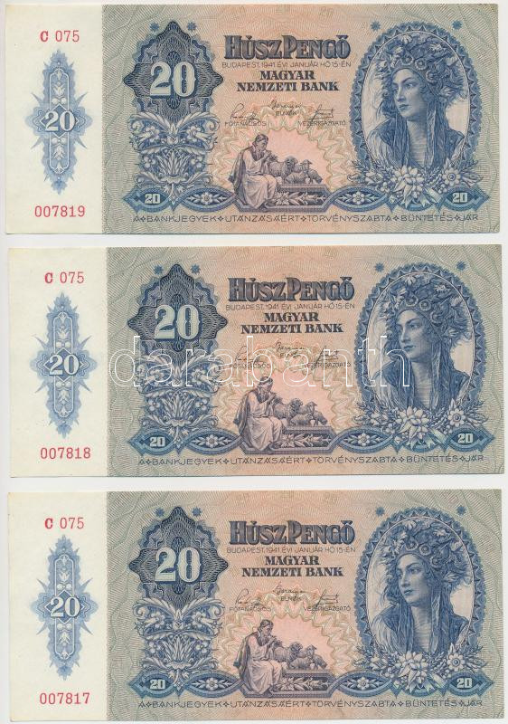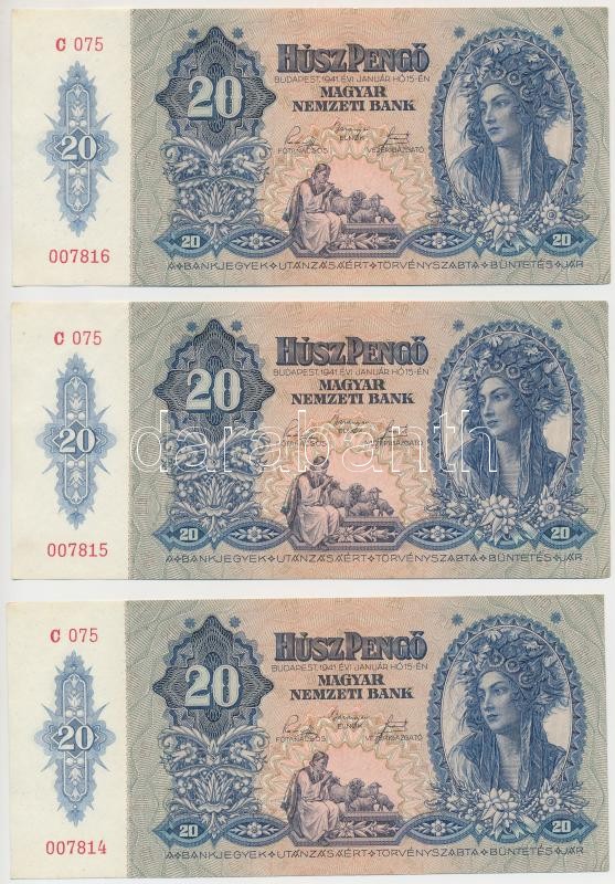 1941. 20P (6x) sorszámkövetők T:I- https://www.darabanth.com/hu/264-Gyorsarveres/264.0/Numizmatika/Magyar-bankjegyek~300006/1941-20P-6x-sorszamkovetok-TI-~II1315796