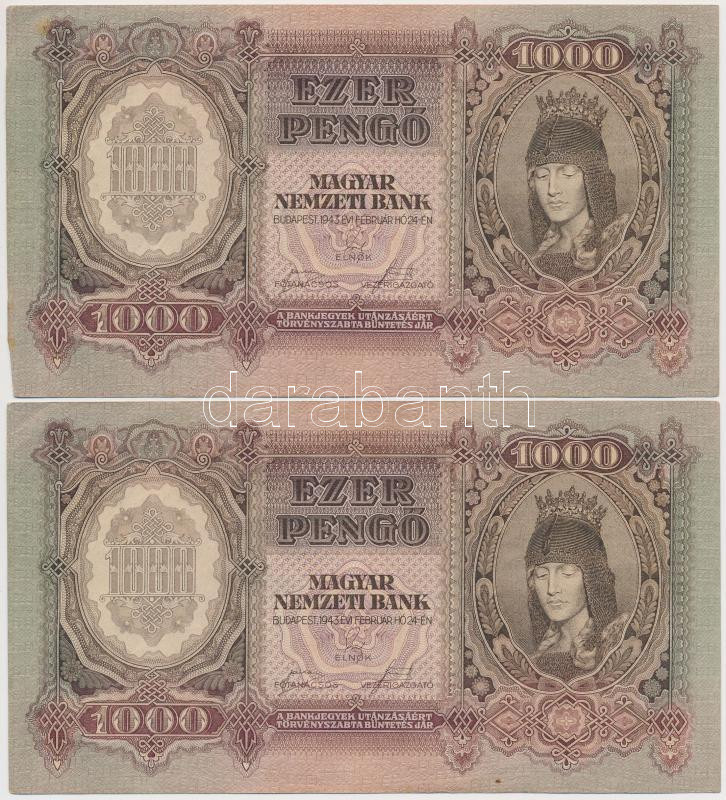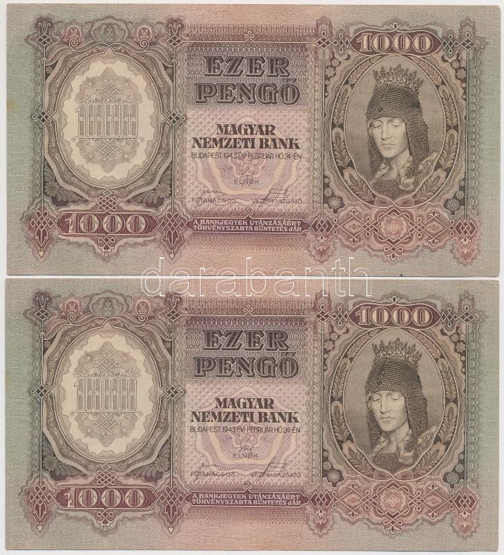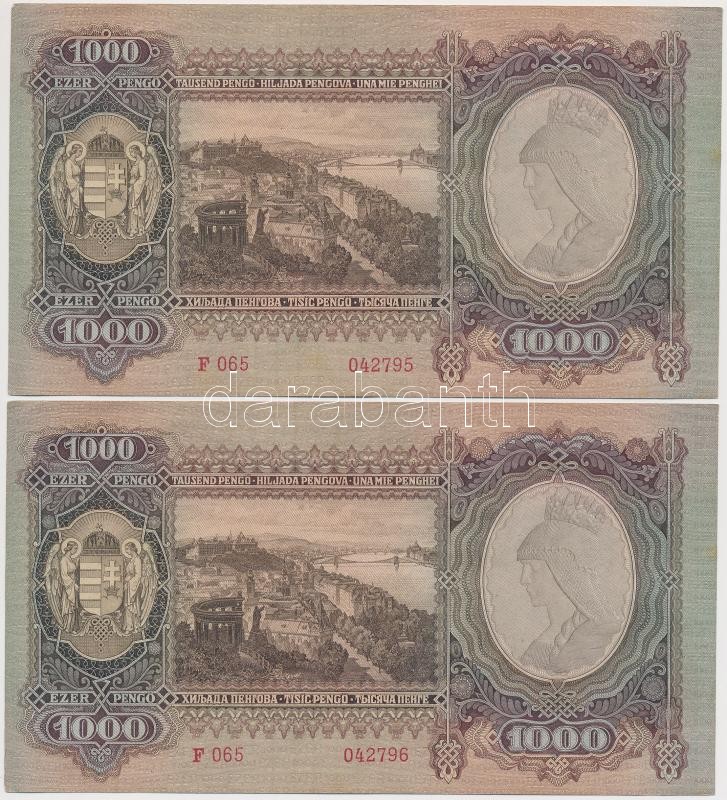 1943. 1000P (4x) sorszámkövetők T:I- https://www.darabanth.com/hu/264-Gyorsarveres/264.0/Numizmatika/Magyar-bankjegyek~300006/1943-1000P-4x-sorszamkovetok-TI-~II1319282