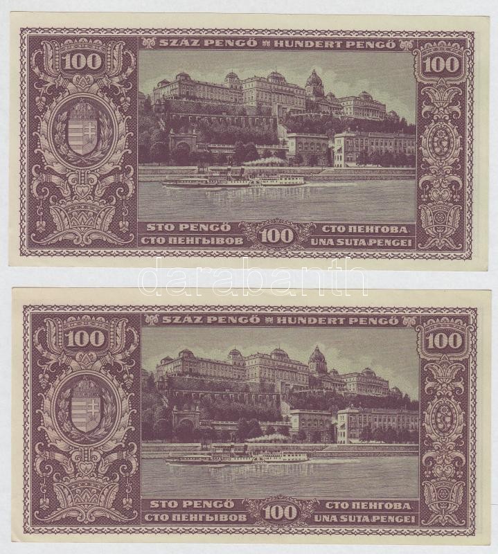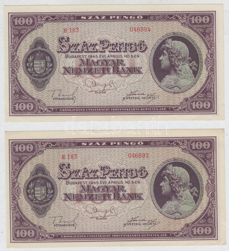 Leírás: 1945. 100P (2x) sorszámkövetők, "BÜNTETÉS" szóban "N" felett lemezhiba T:I-