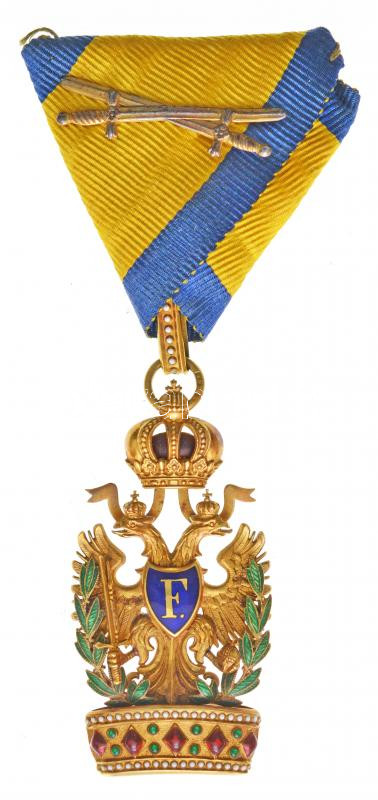 Austro-Hungarian Monarchy 1916. "Order of the Iron Crown, 3rd Class, with a war decoration and swords" enamelled, hallmarked Au decoration with ribbon, with makers mark "AK (Albert Keibel)" and with "750" hallmark C:AU,XF small enamel missing